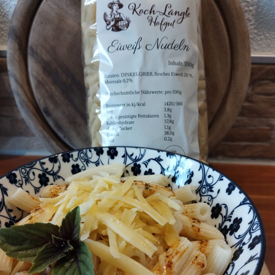 Unsere Eiweiß-Nudeln bestehen nur aus Dinkelgrieß und frischem Eiweiß von unseren Hühnern. Sie enthalten sage und schreibe 38g Eiweiß/100g und sind in vielen verschiedenen Formen erhätlich.